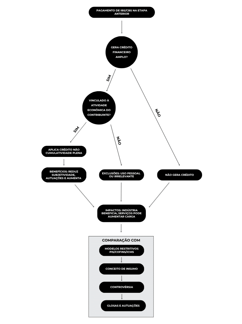 (Fluxograma: Pagamento de IBS/CBS → Gera crédito amplo? → Vinculado à atividade econômica? → Aplicação plena (benefícios: neutralidade, previsibilidade) ou exclusões (uso pessoal/irrelevante) → Impactos setoriais. Contraste com sistema atual: restritivos → insumo → controvérsias → glosas.)